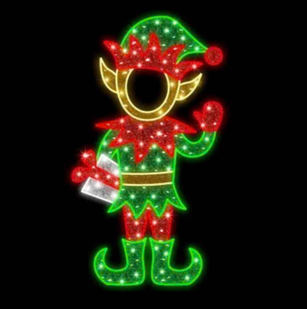 A 7.5 foot by 5 foot playful elf figure with a cut-out face for interactive holiday photos.